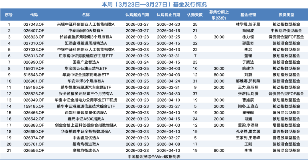本周(3月23日至3月27日),公募基金市场将有21只新基金开售。基金类别上,权益类基金仍占多数。