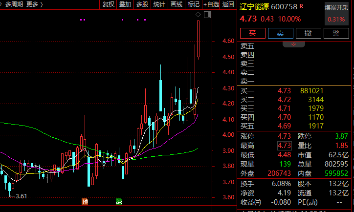 煤炭股早间集体逆市走强,焦炭加工板块指数高开高走,盘中一度飙升逾5%,煤炭开采指数亦大幅高开,逼近历史最高点。辽宁能源开盘仅约1分钟垂直涨停,山西焦煤、云煤能源均快速封板,山西焦化、平煤股份等涨幅居前。