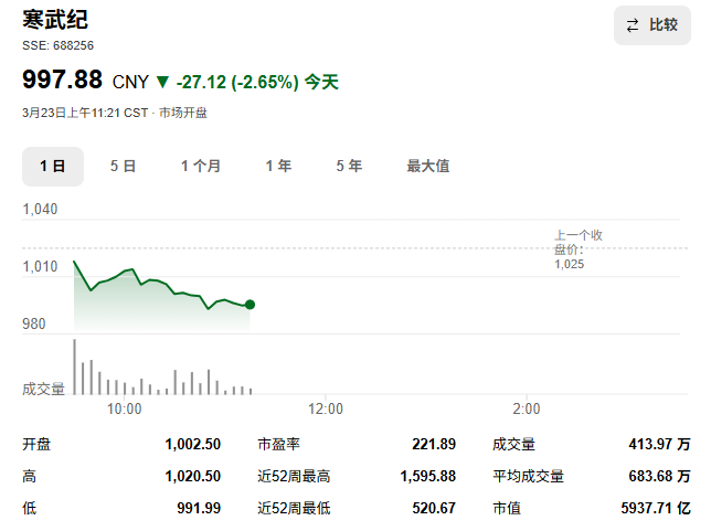 今天(3月23日)上午,寒武纪股价盘中跌破1000元/股。