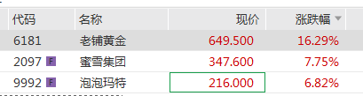 3月24日午后,港股市场新消费板块表现亮眼。截至当日14时53分,被市场称为“新消费三姐妹”的三只龙头股集体大涨:老铺黄金(06181.HK)大涨16.29%,报649.5港元/股;蜜雪集团(02097.HK)涨7.75%,报347.6港元/股;泡泡玛特(09992.HK)涨6.82%,报216港元/股。