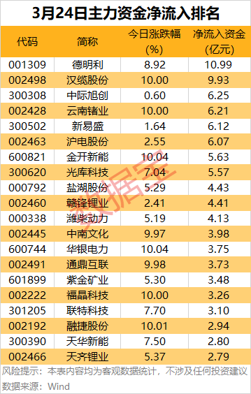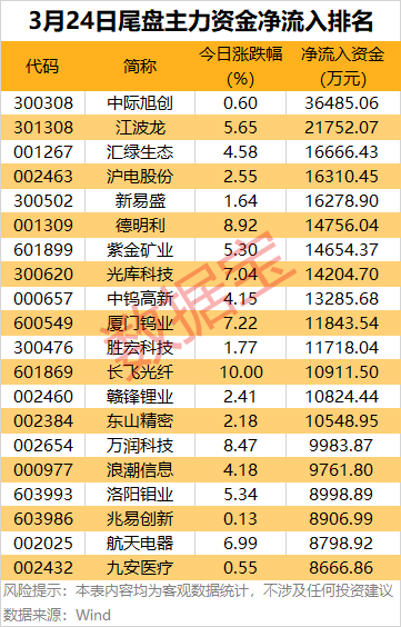 个股方面,中际旭创、江波龙尾盘主力资金大幅净流入,金额均超2亿元。汇绿生态、沪电股份、新易盛、德明利、紫金矿业等主力资金净流入均超1亿元。