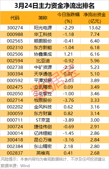 据数据宝统计,今日有26股主力资金净流出均超2亿元,其中,阳光电源、华工科技、顺灏股份、东方新能、协鑫集成、比亚迪、中矿资源等净流出金额居前,均超5亿元。