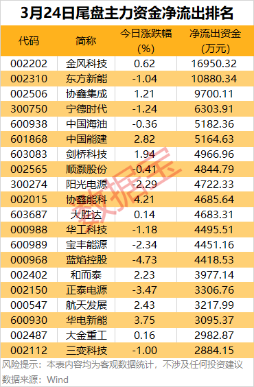 尾盘主力资金净流出方面,金风科技、东方新能尾盘主力资金净流出均超1亿元;协鑫集成、宁德时代、中国海油、中国能建等尾盘主力资金净流出居前,均超5000万元。