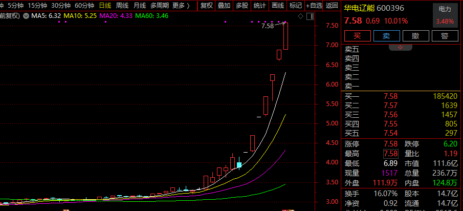 作为绿色电力板块“最靓的仔”,华电辽能(600396)在3月24日延续强劲走势,再度以涨停收盘,录得七连板,报收7.58元/股,市值112亿元。
