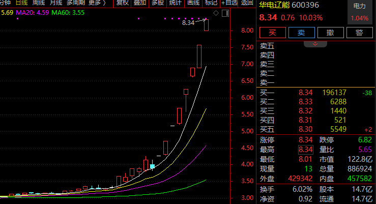 华电辽能(600396)涨停走出8连板,8天累计涨幅超110%。