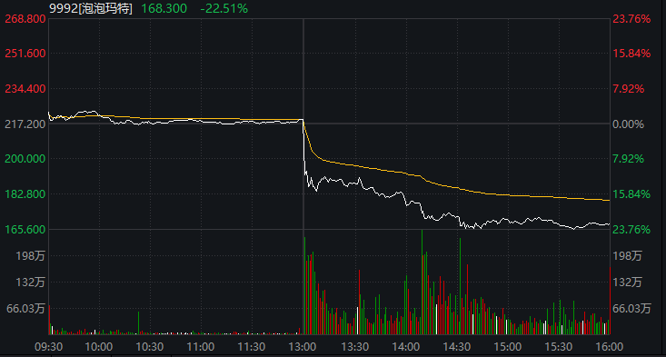 3月25日午后,港股泡泡玛特大跌,截至收盘,跌幅超22%。