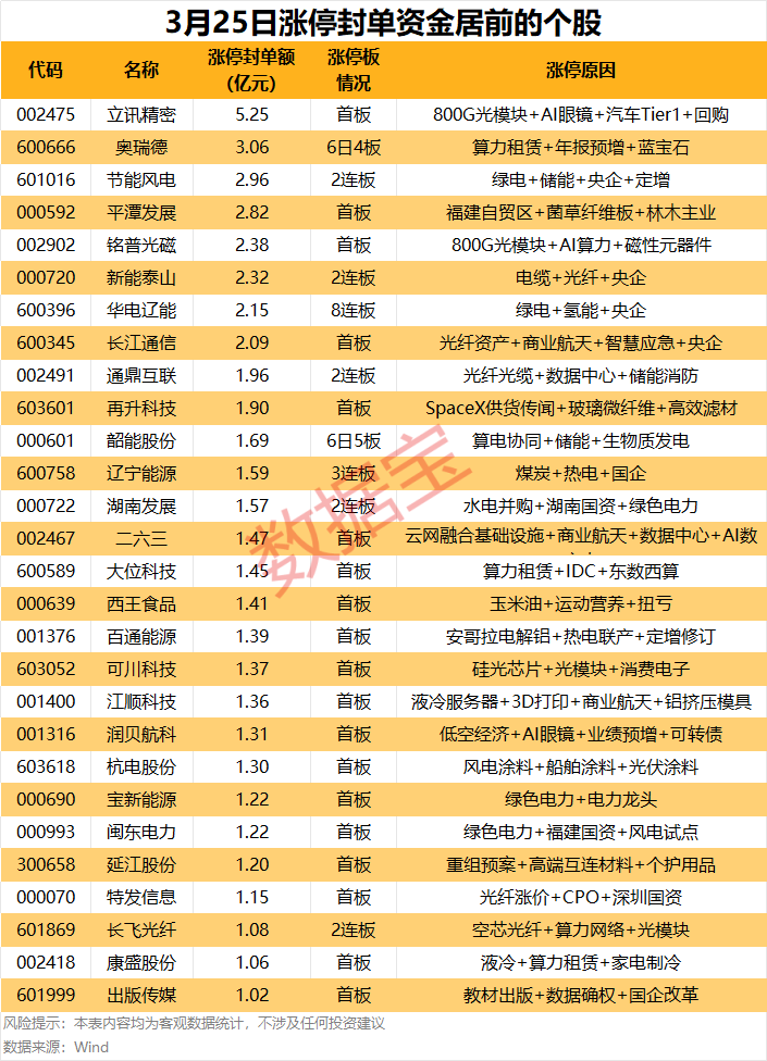 以封单金额计算,28股封单金额均超1亿元,立讯精密、奥瑞德、节能风电涨停板封单资金居前,分别达5.25亿元、3.06亿元、2.96亿元。