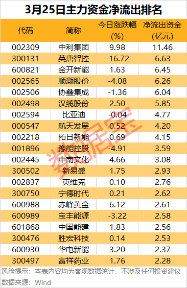 据数据宝统计,25股主力资金净流出均超2亿元,其中,中利集团、英唐智控、金开新能、顺灏股份、协鑫集成、汉缆股份、比亚迪等净流出金额居前。