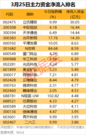 立讯精密、中际旭创、天孚通信主力资金净流入位居前三,均为共封装光学(CPO)概念。