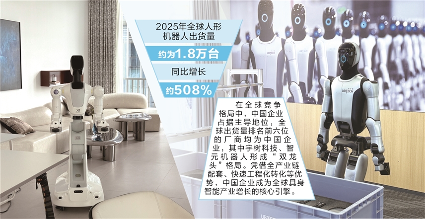 具身智能产业在2025年实现跨越式发展,其中人形机器人出货量已初具规模。知名咨询公司IDC发布的《全球人形机器人市场分析》显示,2025年全球人形机器人出货量约为1.8万台,同比增长约508%。在全球竞争格局中,中国企业占据主导地位,全球出货量排名前六位的厂商均为中国企业,其中宇树科技、智元机器人形成“双龙头”格局。凭借全产业链配套、快速工程化转化等优势,中国企业成为全球具身智能产业增长的核心引擎。