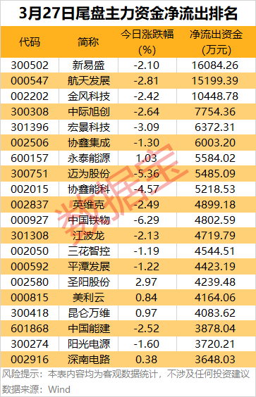 尾盘主力资金净流出方面,新易盛、航天发展、金风科技尾盘主力资金净流出均超1亿元。