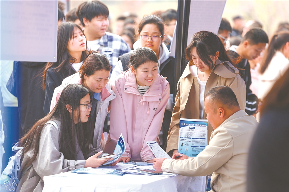 3月27日,求职者在河北地质大学专场招聘活动现场与企业代表交流。