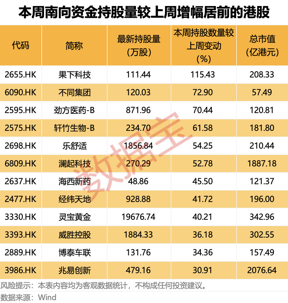 从持股量变化来看,本周12股获得南向资金持股量较上周增长超30%,果下科技居首,增幅达115.43%;其他还有不同集团、劲方医药-B、轩竹生物-B持股量增幅居前,分别为72.9%、70.44%、61.58%。