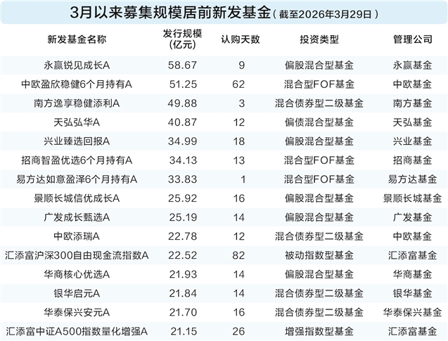此外,在市场对确定性需求提升的背景下,以稳健为目标的基金产品成为3月发行的中流砥柱。在发行规模排名前十的基金中,有多只产品锚定“稳健收益”策略。