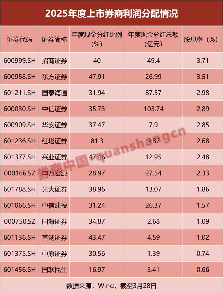除此之外,东方证券、兴业证券、首创证券和招商证券的2025年度现金分红比例也都达到40%及以上,其中东方证券和兴业证券分别为47.91%和47.46%。事实上,在已公布2025年度利润分配方案的14家上市券商中,仅申万宏源为28.97%,国联民生为16.97%,其余公司现金分红比例均超过30%。