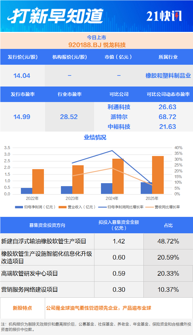 悦龙科技主要从事流体输送柔性管道的研发、生产和销售,包括海洋工程柔性管道、陆地油气柔性管道和工业专用软管三大系列橡胶软管产品。公司核心产品侧重于超高压/高压、超低温/低温、高温、腐蚀、冲蚀等极端复杂工况的高性能市场。