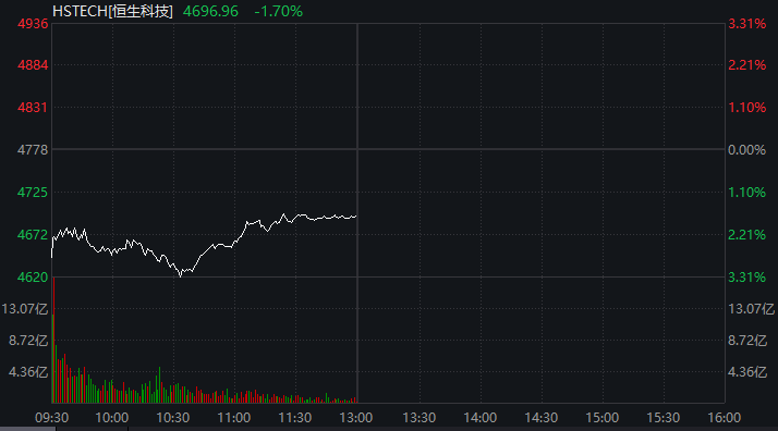 A股、港股方面,沪指、深证成指一度跌超1%,截至午间收盘,沪指翻红、深证成指跌幅收窄至0.12%;恒生指数盘中一度跌超2%,恒生科技指数一度跌超3%,目前跌幅分别收窄至1%及2%以内。