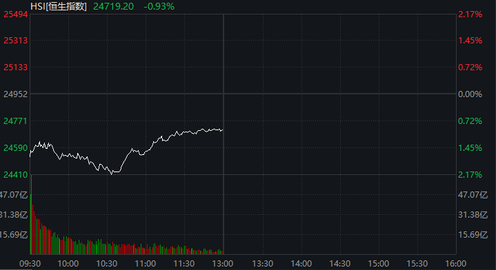 港股市场上午整体出现调整。恒生指数盘中跌幅一度超过2%,恒生科技指数一度跌超3%,目前跌幅均有所收窄。