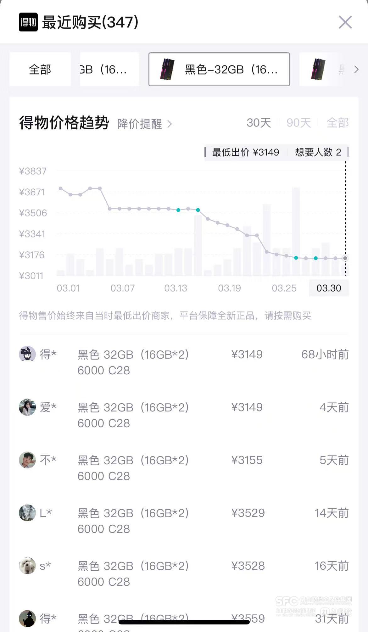 小红书社交平台上,也开始出现了“内存现在能买了吗”“囤的内存亏麻了”等讨论,个人卖家出售闲置内存的帖子明显增多。而在得物潮玩社区平台上,32G DDR5内存条价格在3月5日达到最高价,约3699元一条,目前已经回落至3149元左右。