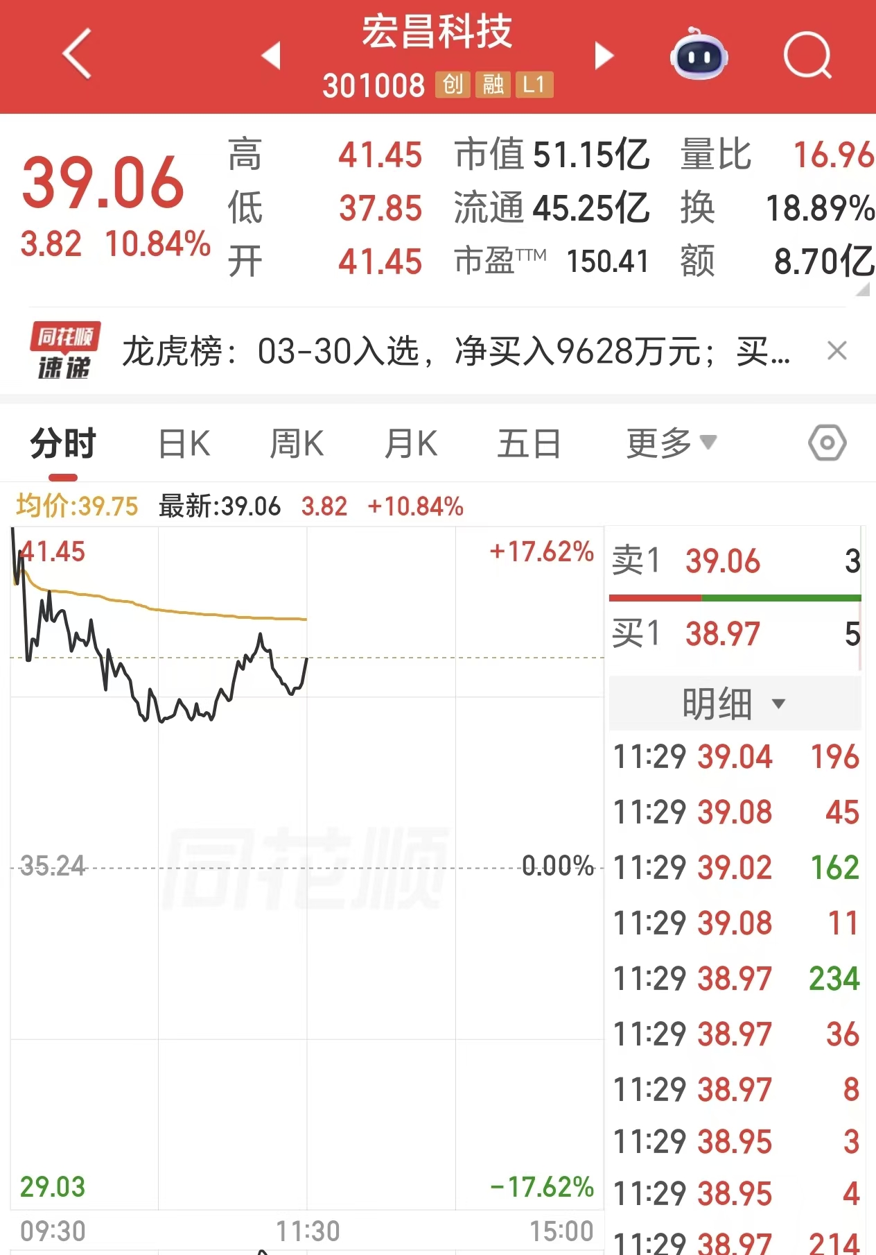 3月31日,宏昌科技(301008.SZ)开盘涨幅一度超过17%。截至上午休盘,其股价涨幅为10.84%,报39.06元/股,市值为51.15亿元。此前一日,该股实现“20cm”涨停。