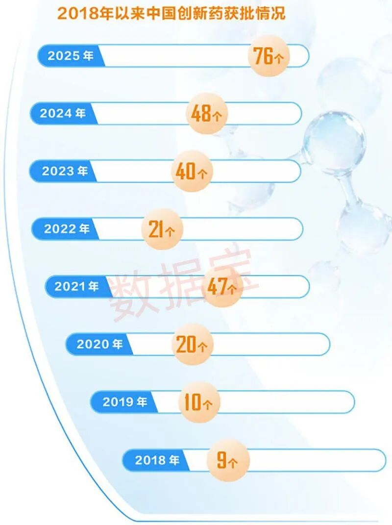国家药监局数据显示,2025年国内获批创新药76个,再创历史新高;化学药品、生物制品领域国产创新药占比分别达80.85%、91.3%,本土创新已成主力。