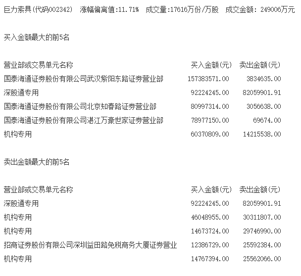 人民财讯3月31日电,商业航天概念股今日表现活跃,巨力索具涨停,全天成交24.9亿元,其盘后数据显示,多家游资买入。国泰海通证券武汉紫阳东路证券营业部买入1.57亿元,卖出383万元;国泰海通证券北京知春路证券营业部买入8100万元,卖出306万元。国泰海通证券湛江万豪世家证券营业部买入7898万元,卖出7万元。