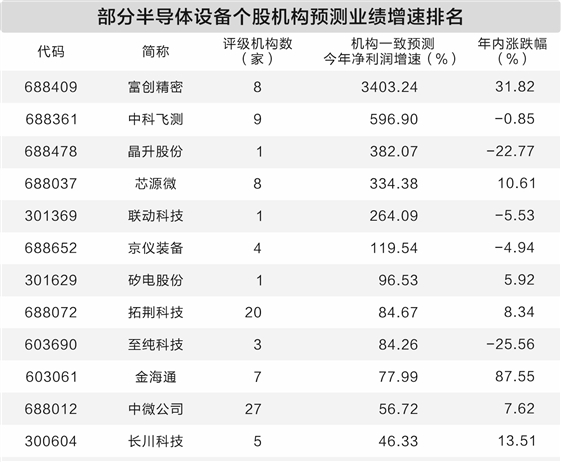 整个半导体设备产业高景气也值得期待。Wind机构一致预测数据显示,有机构评级的半导体设备个股今年净利润预测增速均超20%,其中富创精密、中科飞测、晶升股份、芯源微等个股预测净利润增速均超100%。