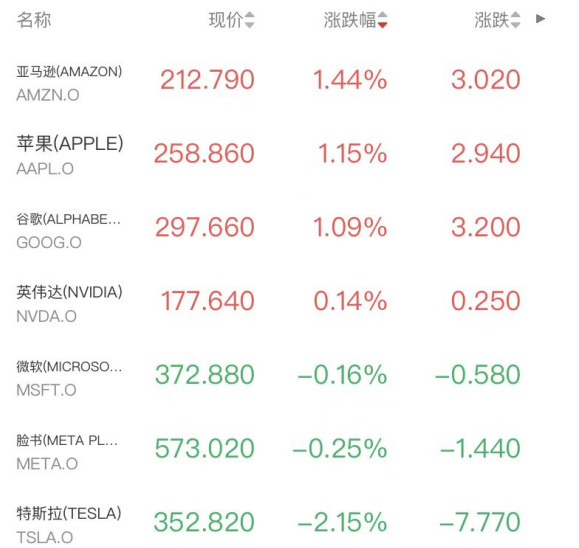 明星科技股涨跌互现,亚马逊、苹果和谷歌涨超1%,英伟达涨0.14%,微软、Meta小幅走低,特斯拉跌2.15%,摩根大通下调特斯拉盈利预期,警告其股价存60%下行空间。