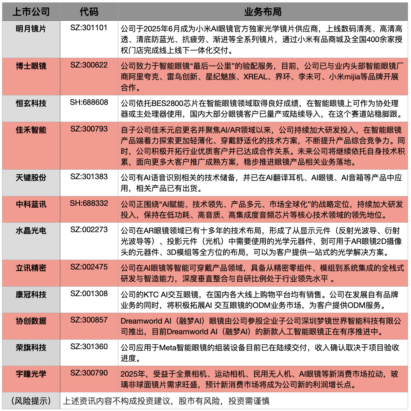 中信建投研报指出,2023年9月Meta开启AI眼镜时代,2025年行业进入产品爆发期,预计谷歌等公司AI眼镜产品也将在26-27年陆续推出。政策层面,2026年AI眼镜产品纳入国补相关范畴,有望带动消费需求进一步提升。镜片厂商目前主要在销售渠道、定制镜片领域卡位,带动客单价提升,展望未来,或可依托自身在树脂材料、光学领域的积累,深入产业链更多环节,如光波导、电致变色、眼球追踪等光电元件,分享更多产业链价值。