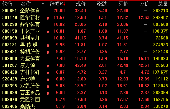 体育概念盘中震荡走高,截至收盘,金陵体育20%涨停,隆华新材涨超10%,舒华体育、中体产业、共创草坪、粤传媒等均涨停。