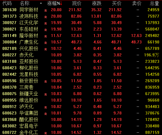 化肥概念亦走强,截至收盘,赤天化、泸天化、六国化工、鲁西化工、金正大均涨停,华鲁恒升涨超9%。