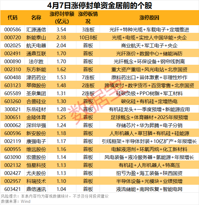 以封单金额计算,汇源通信、新能泰山、航天电器等涨停板封单资金居前,分别有3.54亿元、2.18亿元、2.04亿元。从封单力度(封单量占流通A股比例)来看,汇源通信、如意集团、新能泰山等力度较大,分别为8.92%、3.60%、2.65%。
