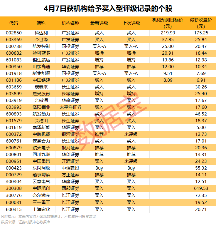 今日获机构买入型评级个股中,共有8条评级记录中对相关个股给出了预测目标价。以公布的预测目标价与最新收盘价进行对比显示,共有5股上涨空间超20%,今世缘上涨空间最高,4月7日广发证券预计公司目标价为37.85元/股,上涨空间达46.48%;上涨空间较高的个股还有中国铁建、科达利等,上涨空间分别为28.65%、25.50%。