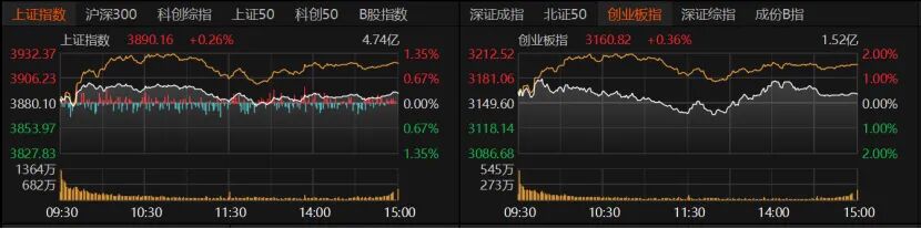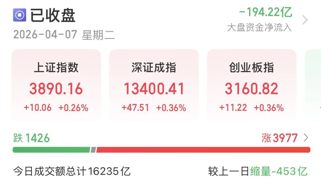 清明小长假后首个交易日,市场表现喜忧参半:好消息是股指收红,坏消息是成交量萎缩。A股指数整体震荡企稳收红,盘中一度下探翻绿,最终尾盘微涨。沪指收涨0.26%,报3890.16点;创业板指收涨0.36%,报3160.82点;深证成指同样收涨0.36%。沪深300、上证50平盘报收,科创50收涨1.42%,北证50收跌0.34%。