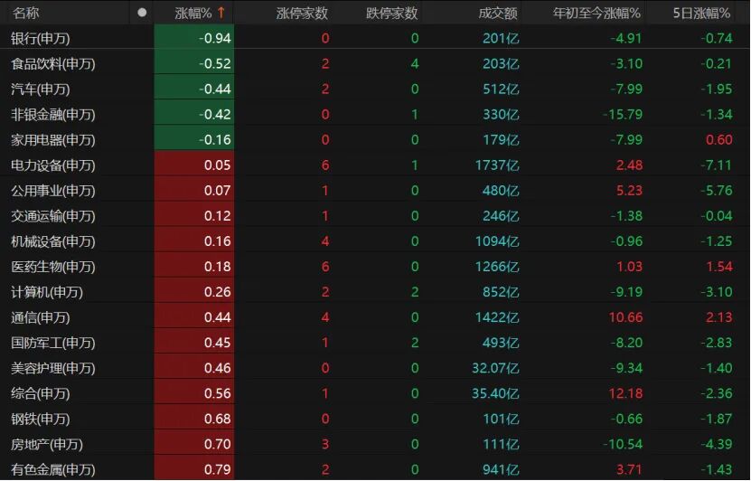 31个申万一级行业中,银行、食品饮料、汽车、非银金融、家用电器板块收跌,但整体跌幅均未超过1%。