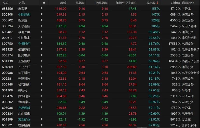 个股整体涨多跌少,共计3977只个股收红,涨停股101只;1426只个股收跌,跌停股18只。寒武纪日成交额155亿元,收涨9.1%,报1119元/股;中际旭创、新易盛均收红,天孚通信调整明显,跌幅近5%。