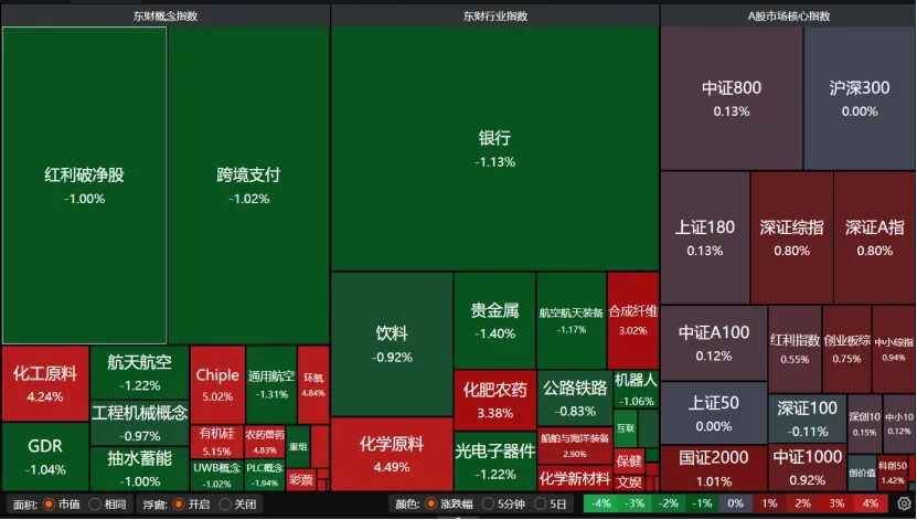 盘面上,银行、贵金属、饮料、航天航空、光电子器件、机器人、红利破净股板块普遍调整,而化肥农药、化学原料、Chiplet(先进封装)概念板块强势领涨。