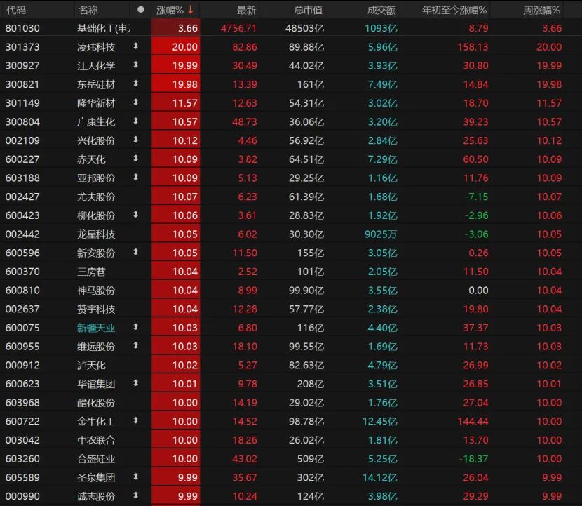 基础化工板块表现尤为亮眼,合计33只个股涨停,凌玮科技、江天化学、东岳硅材斩获“20cm”涨停,兴化股份、赤天化、亚邦股份、尤夫股份、柳化股份、龙星科技、新安股份、三房巷、神马股份、赞宇科技、新疆天业、维远股份等纷纷涨停。