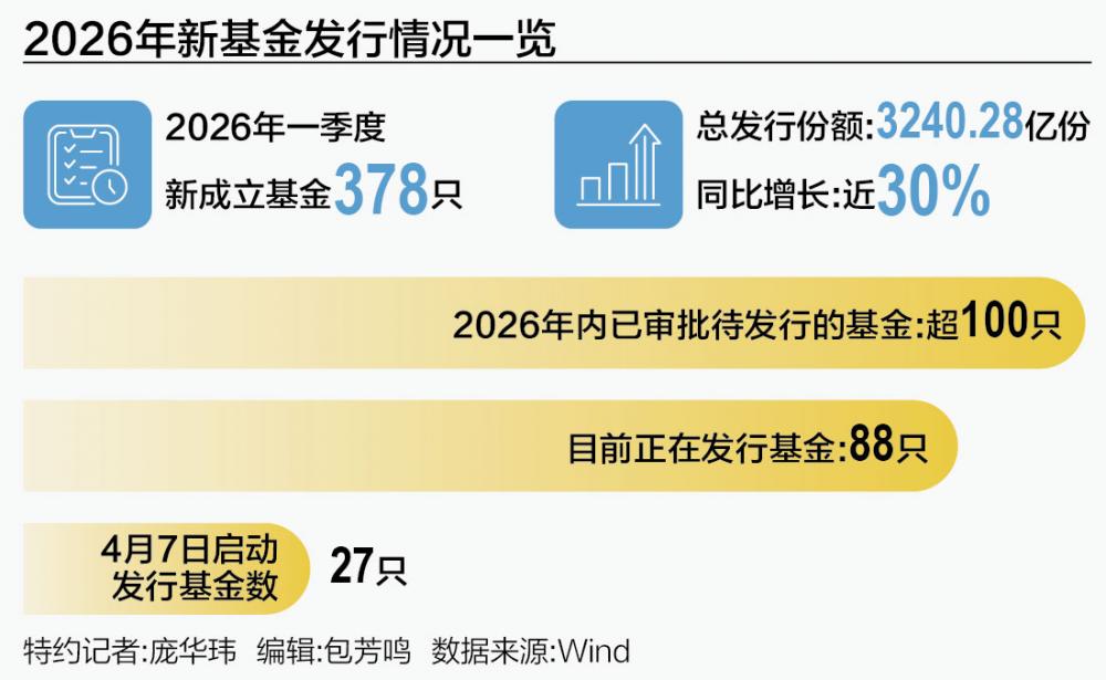 4月7日,清明假期后首个交易日,27只基金启动发行。Wind数据显示,当前全市场共有88只基金正在发行,近两周还将有40只基金启动发行。此外,年内已审批待发行的基金还有超100只。