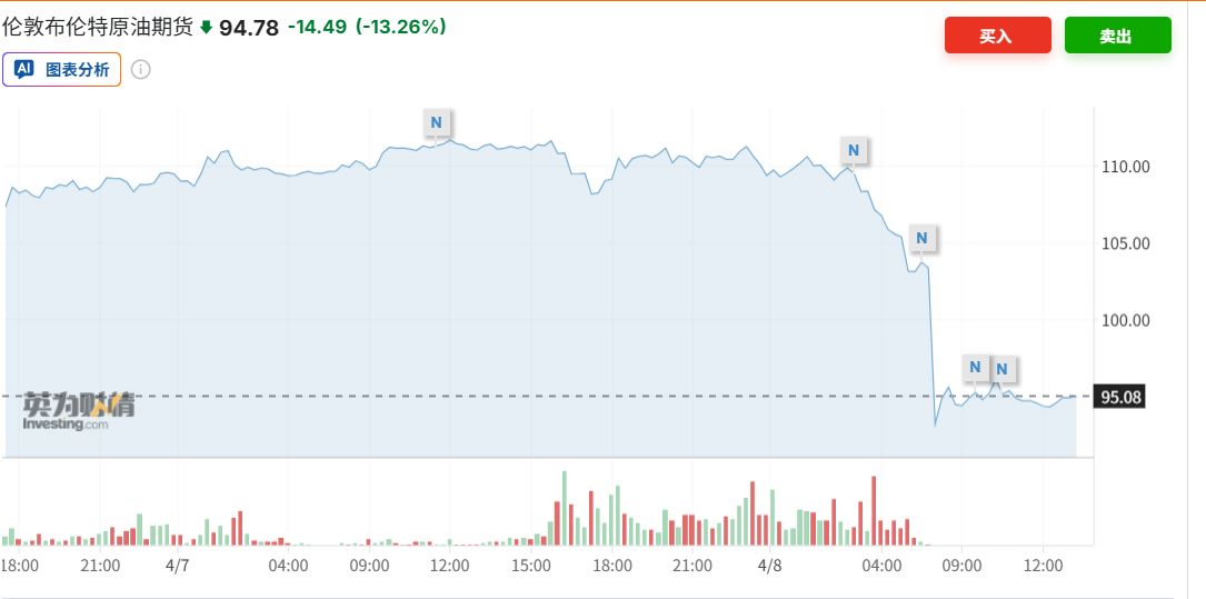 由巴基斯坦紧急斡旋的一纸两周临时停火协议突然落地。消息传出,紧绷至极的市场情绪瞬间缓解,布伦特与WTI原油期货价格直线跳水,狂泻超15%,双双击穿100美元大关,美股期指与黄金随之剧烈震荡。