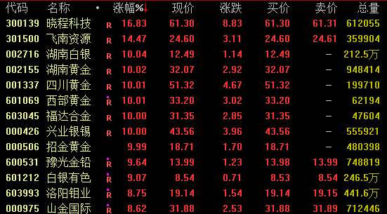 黄金概念股盘中走势活跃,截至收盘,湖南黄金、四川黄金、西部黄金、招金黄金等涨停。