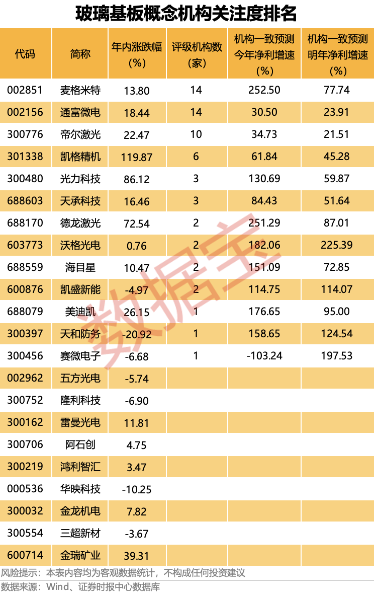 据证券时报·数据宝统计,A股市场上合计有22只玻璃基板概念股。其中,沃格光电、天和防务、凯盛新能等个股机构一致预测今明两年净利增速均超100%,成长性惊人。此外,麦格米特、德龙激光、美迪凯等机构一致预测今明两年净利增速均超50%。
