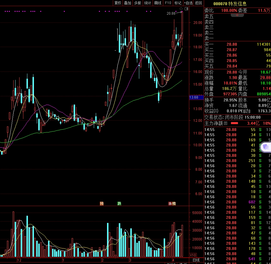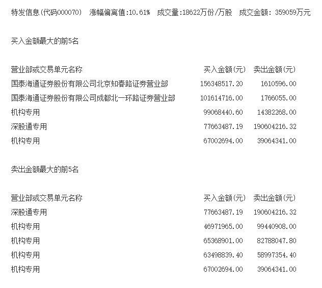 人民财讯4月9日电,CPO概念股特发信息午后拉升涨停,股价创历史新高,此前一度跌逾3%。全天成交金额35.9亿元。特发信息盘后龙虎榜数据显示,国泰海通证券北京知春路证券营业部买入1.56亿元,为当日买入特发信息金额最大的营业部。国泰海通证券成都北一环路证券营业部买入约1亿元。两家营业部卖出金额均较小。卖出方面,有四家机构卖出。