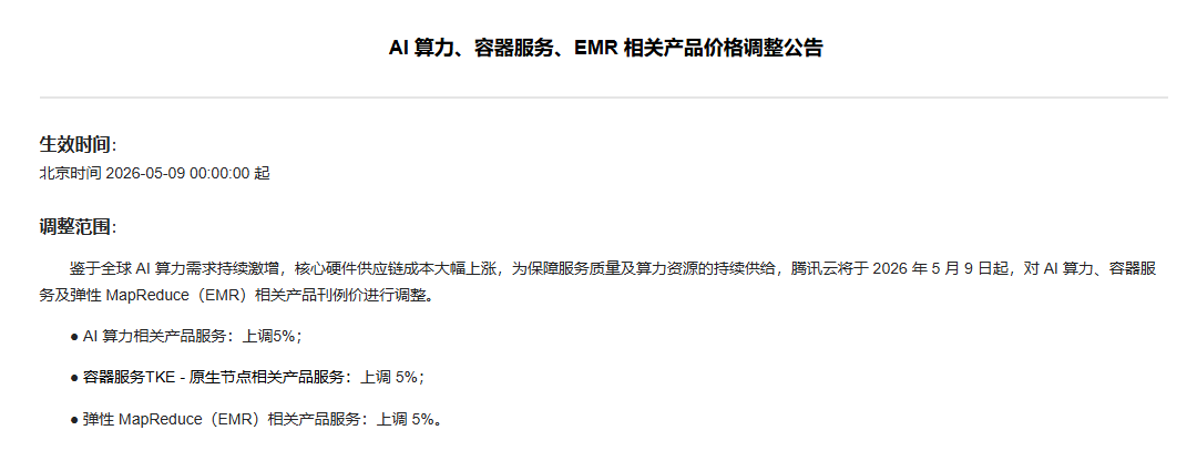 继3月11日对部分模型启动正式收费及并涨价后,4月9日,腾讯云宣布将于2026年5月9日起,对AI算力、容器服务及弹性MapReduce(EMR)相关产品刊例价进行调整: