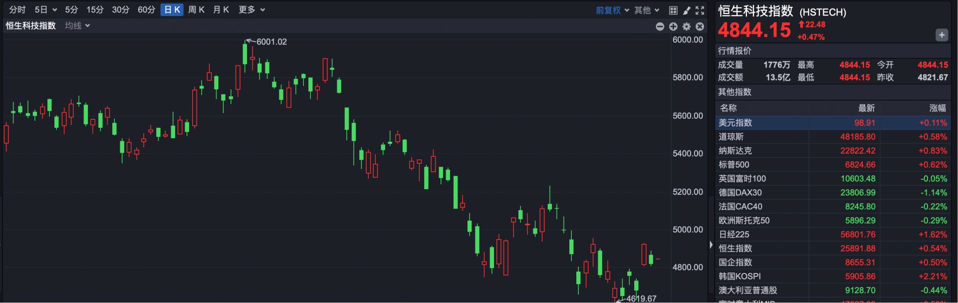 恒生科技指数开盘报4844.15点,上涨22.48点,涨幅0.47%。