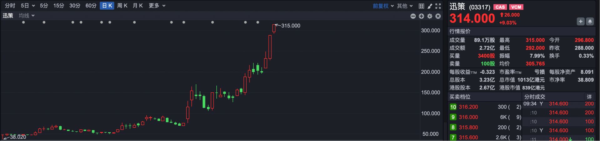 盘面热点方面,“词元第一股”迅策(HK03317)继昨日大涨23%之后,今日早盘再度涨超9%,股价继续创出上市以来新高。