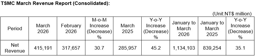 台积电:3月销售额4151.91亿元台币 同比增长45.2%