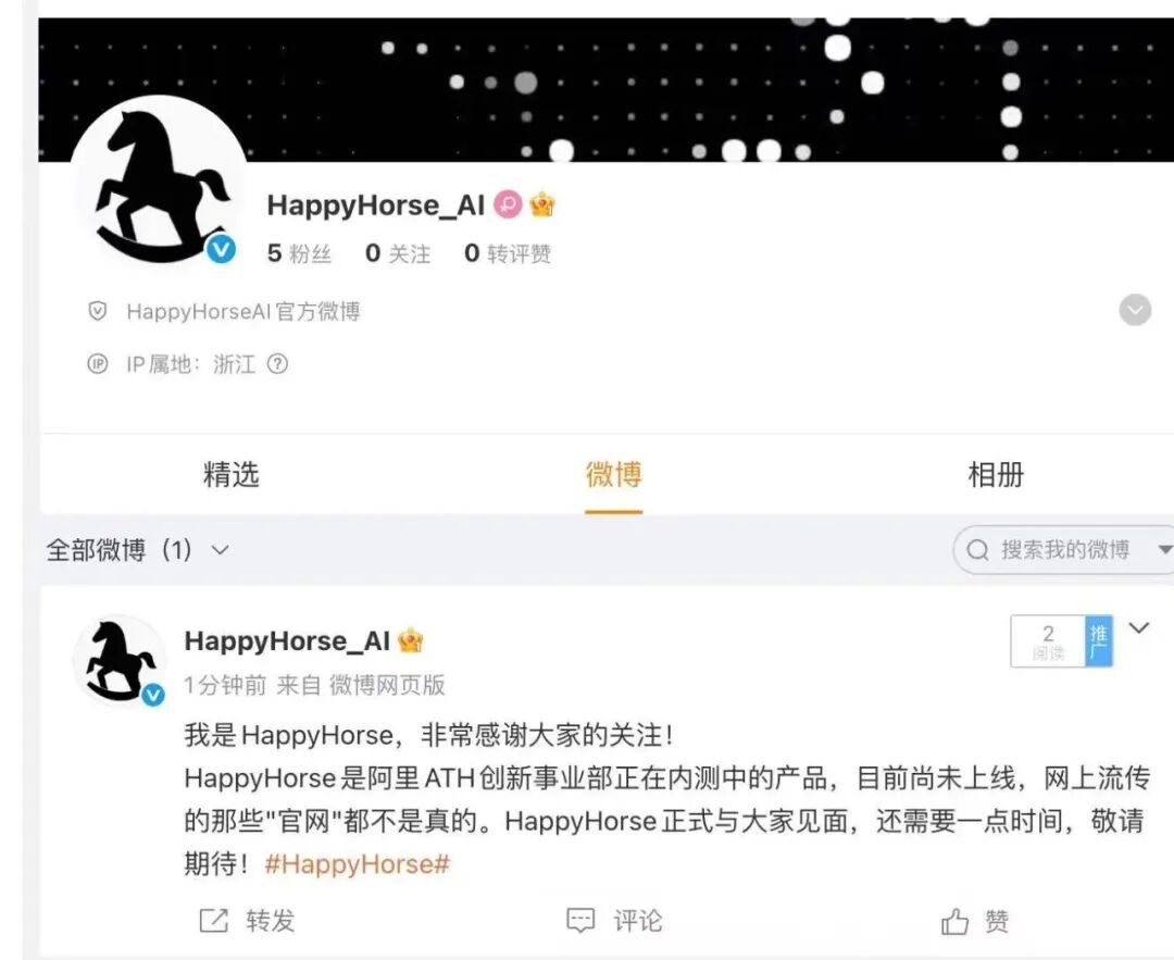 当前,HappyHorse已在海外社交平台注册账号,其首位关注者为阿里巴巴集团。此前有市场消息称,HappyHorse是来自阿里旗下淘天集团未来生活实验室张迪领导的团队所研发,目前未来生活实验室已从淘天集团独立,归属于ATH事业群的AI创新事业部。