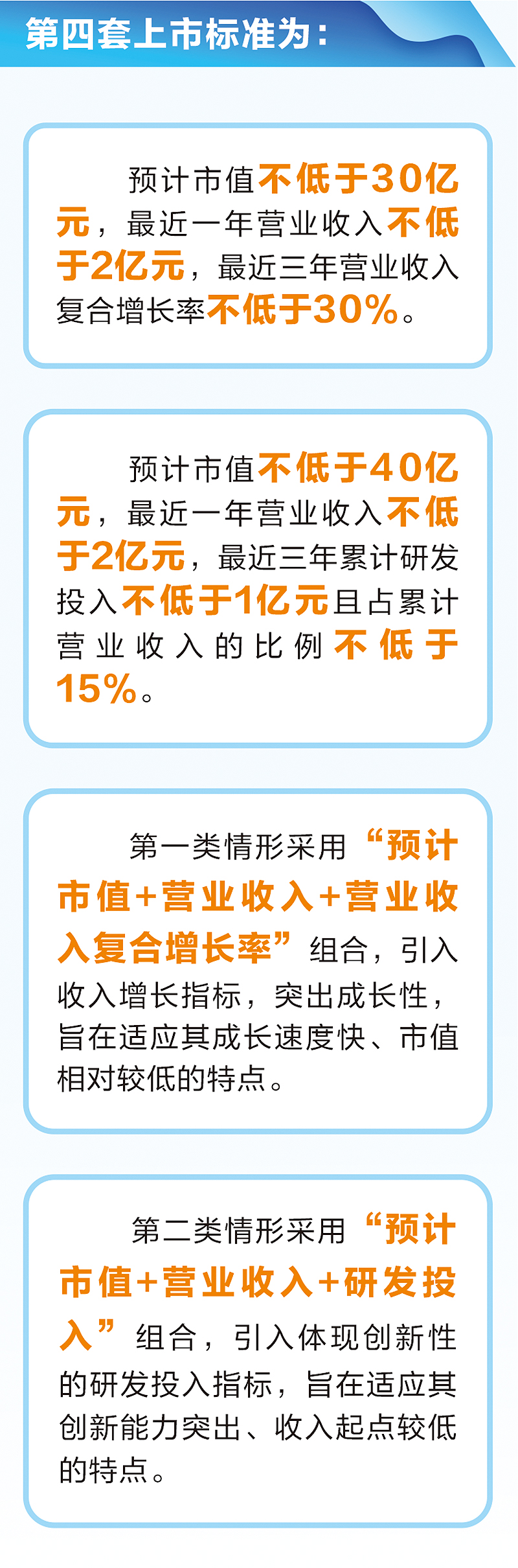 第一类情形“预计市值不低于30亿元,最近一年营业收入不低于2亿元,最近三年营业收入复合增长率不低于30%”,采用“预计市值+营业收入+营业收入复合增长率”组合,引入收入增长指标,突出成长性,旨在适应其成长速度快、市值相对较低的特点;第二类情形“预计市值不低于40亿元,最近一年营业收入不低于2亿元,最近三年累计研发投入不低于1亿元且占累计营业收入的比例不低于15%”,采用“预计市值+营业收入+研发投入”组合,引入体现创新性的研发投入指标,旨在适应其创新能力突出、收入起点较低的特点。