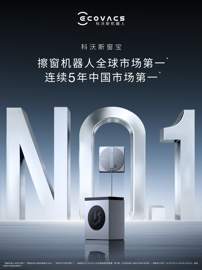 根据IDC咨询的数据,作为家用清洁机器人的重要补充品类,擦窗机器人2025年全球出货量达237.3万台,同比增长70.4%。其中,科沃斯以超过50%的市场份额稳居行业首位。与此同时,奥维云网(AVC)的监测数据亦表明,2025年科沃斯销售额占比超6成,连续第五年蝉联中国擦窗机器人市场规模第一。